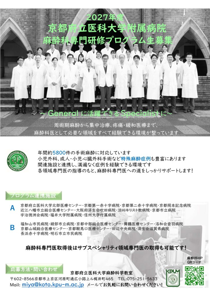 2027年度京都府立医科大学麻酔科専門研修プログラム生を随時募集しております。歴史や文化に囲まれた自然豊かな京都の地で、麻酔科専門医を目指してともに働いてみませんか。興味のある方は随時見学を受け付けております。miya@koto.kpu-m.ac.jpまで、お気軽にお問い合わせください。