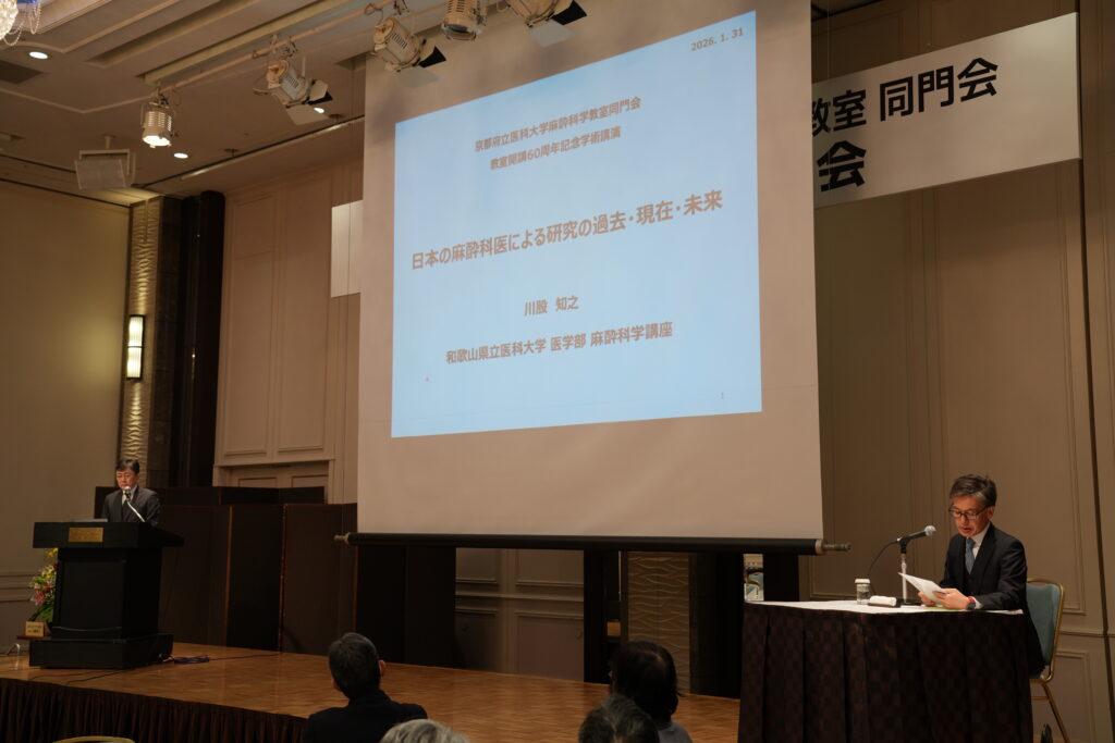 1/30(土)京都ホテルオークラにて、当教室同門会および教室設立60周年記念祝賀会を開催いたしました。記念講演では和歌山医科大学麻酔科学教室 川股教授より麻酔科医による研究をテーマにご講演いただき、研究を取り巻く環境など様々な課題があり、課題解決の重要性を改めて認識することができました。また、60周年記念祝賀会では同門である名古屋大学麻酔・蘇生医学講座 秋山教授より名古屋大学における取り組みをご紹介いただき、非常に圧倒されるとともに励みをいただくことができました。さらに2月から山梨大学麻酔科学教室の教授にご就任される小川先生からご挨拶をいただきました。これまでの感謝の花束をお渡ししするとともに小川先生のご活躍を祈念しました。ご参加およびご支援賜りました先生方には厚く御礼を申し上げます。